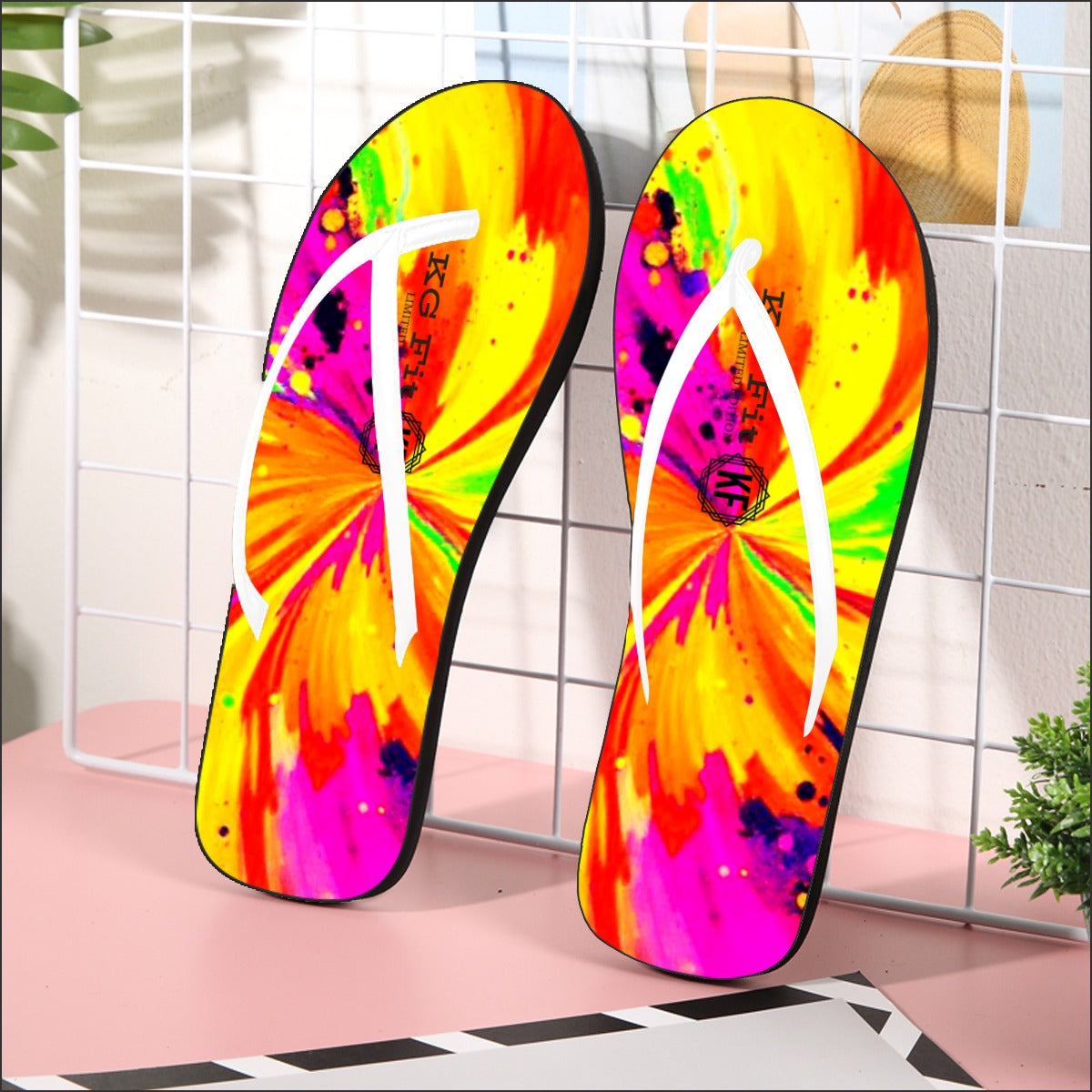 Step into vibrant style with these KG Flip Flops from the Psychedelic collection. Perfect for outdoor adventures or daily wear, these flip flops offer a bold look and all-season comfort. The eye-catching front print adds a unique touch that stands out in any setting, while the soft and breathable design ensures your feet stay comfortable no matter where you go.